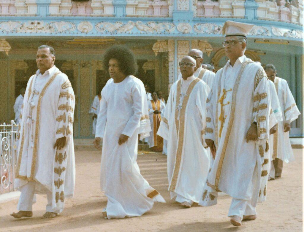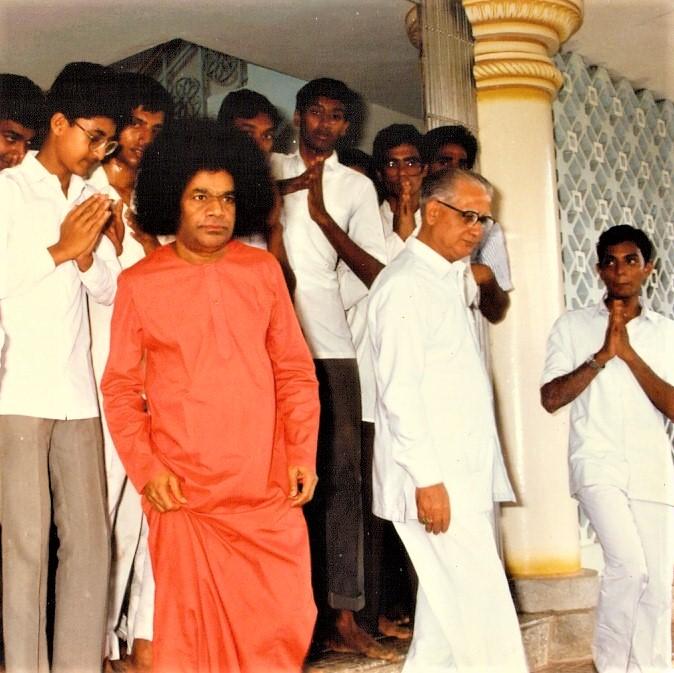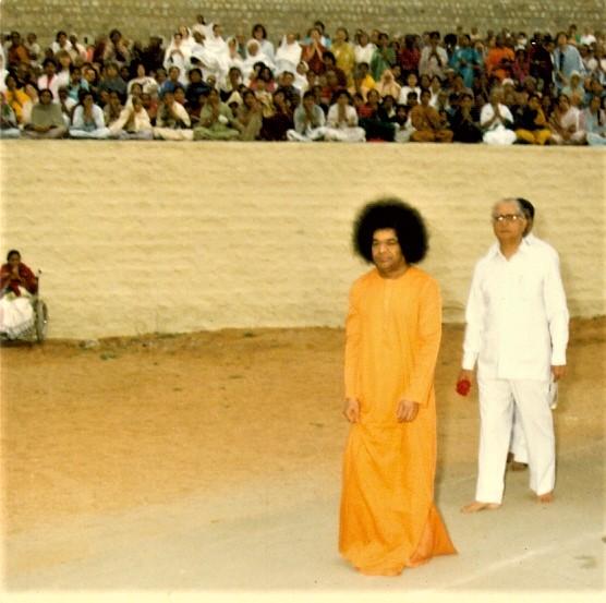 Dr. Somnath Saraf following Sri Sathya Sai at the Hill View Stadium, Prasanthi Nilayam